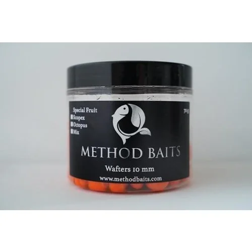 Wafters zijn zeer populair, en niet voor niets. Dit gewichtloze haakaasje zweeft als het ware net boven de bodem, wat er voor zorgt dat het zich natuurlijk gedraagt als een vis voorbij komt zwemmen. Een groter bijkomend voordeel is dat het aasje bij een voorzichtige opzuiging al de bek van de vis in schiet. Schuwere vissen worden op deze manier sneller gevangen. Door de kleur en geur springen deze wafters boven alles uit. Het contrast ten opzichte van de bodem is groot maar ook met bijvoorbeeld pellets of grondvoer. Stel u gebruikt op uw method korf 2 mm Trouvit pellets (bruin) en een opvallende wafter, dan creëert u een groot contrast wat de nieuwsgierigheid van een vis kan triggeren. De sterke aroma van de wafters wordt veroorzaakt door alcoholische flavours van zeer hoge kwaliteit.