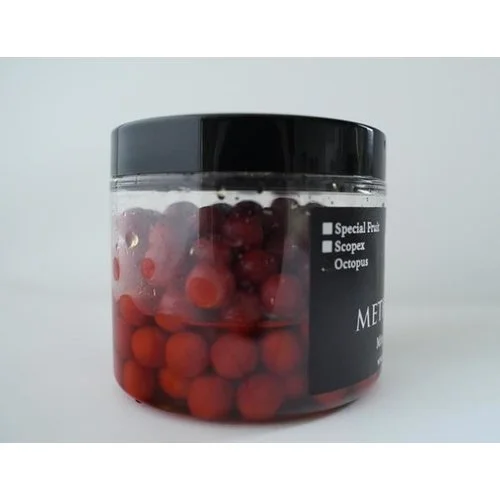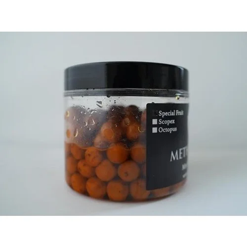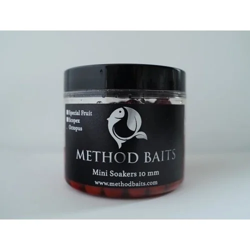 De Method Baits ‘soakers’ is ons meest unieke product uit het assortiment, een zéér onderschat haakaas. De mini voer boilies uit ons assortiment zijn geheel naar ons eigen recept gedraaid, alle vloeistoffen (olie + flavour) worden tijdens het draai proces toegevoegd aan de mix. Na elke productie laten we bewust een hoeveelheid deeg over, om de soakers van te maken. Dit deeg wordt opnieuw in de menger gegooid met wederom een stevige hoeveelheid van diezelfde vloeistoffen. Na het draaiproces worden de soakers (10 mm boilies) verpakt in potjes inclusief deze vloeistof. De mini boilies zijn dus doordrenkt met dezelfde vloeistoffen als waar ze in fase 1 mee zijn gemaakt. Door dit als haakaas te gebruiken springt net deze ene boilie er gigantisch boven uit wat betreft attractie. Een echte aanrader!