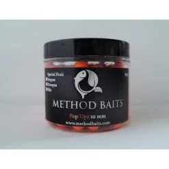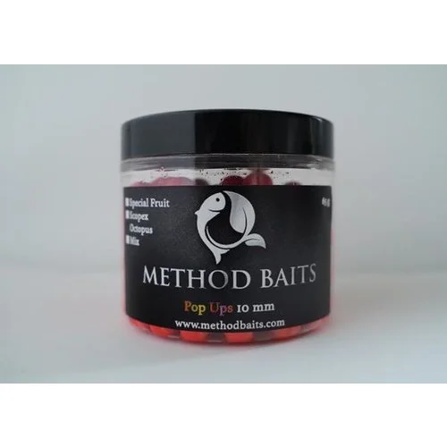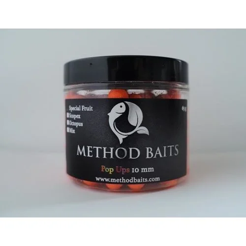 Deze mix bestaat uit een combi van de: Special Fruit, Octopus & Scopex. De kleine 10 mm Fluo Pop-ups zijn uitermate geschikt om in te zetten bij het method feeder vissen, door de kleur en geur springen deze pop ups boven alles uit. Het contrast ten opzichte van de bodem is groot maar ook met bijvoorbeeld pellets of grondvoer. Stel u gebruikt op uw method korf 2 mm Trouvit pellets (bruin) en een oranje fluo pop-up, dan creëert u een groot contrast wat de nieuwsgierigheid van een vis kan triggeren. Ook bij de Method Baits fluo pop-ups is er gebruik gemaakt van flavours op alcohol basis.
