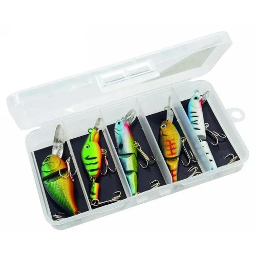 Assortiment 5 meerdelige, drijvende pluggen in handige opbergdoos. Diverse kleuren, verschillende diepgangen.